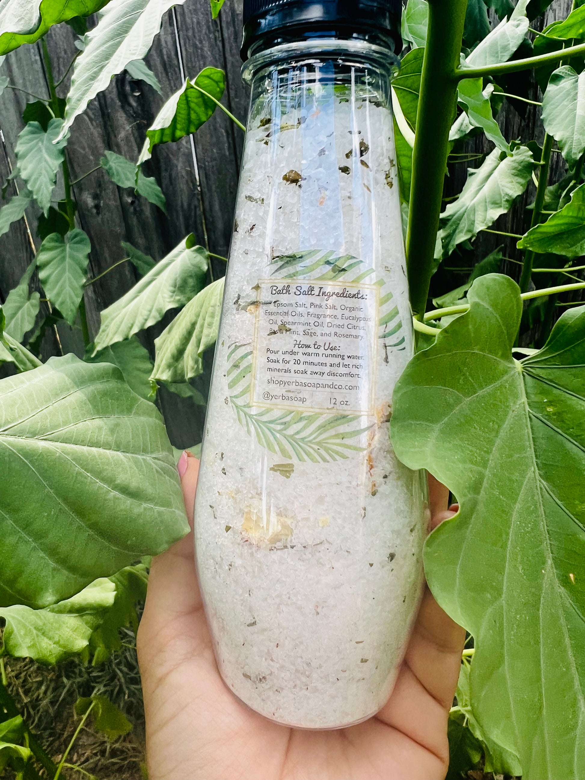 Ingredients: Epsom Salt, Pink Salt, Organic Essential Oils, Fragrance, Eucalyptus Oil, Spearmint Oil, Dried Citrus, Homegrown Sage, Rosemary, Spearmint, Basil, Lavender, Organic Essential Oils
